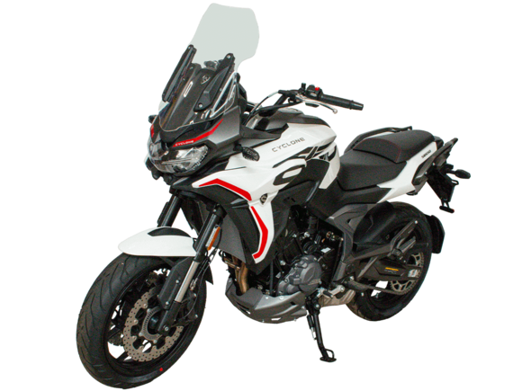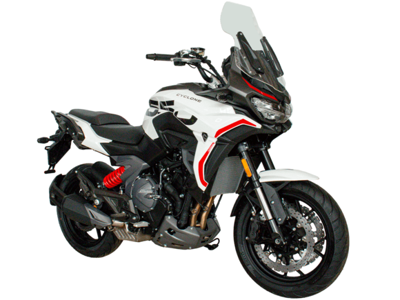 CYCLONE RG401 (SR400GS-B) – турист для покорения самых непростых и протяжённых маршрутов. Он обладает стремительным и современным дизайном в лучших “традициях жанра” туристических мотоциклов.Рядный двухцилиндровый четырёхтактный двигатель объёмом 401 см3 выдаёт 43 л.с. на 9500 об/мин. Максимальный крутящий момент достигается на 8000 об/мин и составляет 37 Н·м. Инжекторный впрыск топлива с блоком управления BOSCH увеличивает топливную экономичность, а также позволяет добиться высокой приёмистости и неприхотливости агрегата. Жидкостная система охлаждения не допустит перегрева двигателя а даже на самых непростых маршрутах. На мотоцикл установлена 6-ступенчатая механическая коробка передач.Максимальная скорость мотоцикла составляет 155 км/ч.RG401 оснащён литыми алюминиевыми дисками диаметром 17 дюймов. Колёса обуты в бескамерные покрышки TIMSUN. С неровностями дороги эффективно справляются телескопическая вилка перевёрнутого типа спереди и маятник с моноамортизатором сзади. Ход передней подвески составляет 120 мм, задней – 55 мм. Оба компонента подвески являются регулируемыми. Эффективное и безопасное замедление с любых скоростей обеспечивают гидравлические дисковые тормоза с двухканальной системой ABS спереди и сзади.Клиренс мотоцикла составляет 155 мм. Объём топливного бака – 21 л. Снаряжённая масса – 213 кг.Модель имеет два видеорегистратора, механическую регулировку ветрового стекла, датчики давления в шинах, подсветку пультов и два USB-порта. При желании можно оснастить мотоцикл двумя боковыми кофрами.Мотоцикл сочетает в себе отличные технические характеристики, комфорт и надёжность, что позволяет вам ощутить настоящую свободу на любой дороге.