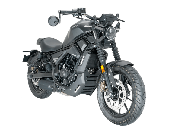 Мотоцикл ZONTES ZT350-V1 – дерзкий круизёр с современным дизайном и классической геометрией. Хорошо подходит как для повседневных поездок по городу, так и для покорения дальних маршрутов.Силовая установка представлена одноцилиндровым 4-тактным двигателем ZT184MP с 4 клапанами и 2 верхними распредвалами. Двигатель имеет объём 348 см³ и обеспечивает мощность в 39 л.с. Оснащён инжектором BOSCH и системой жидкостного охлаждения. Механическая коробка передач имеет 6 ступеней и схему 1-N-2-3-4-5-6. Запуск двигателя осуществляется с помощью бесключевого доступа.Ёмкость топливного бака 15 литров.Колёса представлены литыми алюминиевыми дисками диаметром 17 дюймов. На мотоцикл установлены датчики давления в шинах, показатели от которых выводятся на приборную панель. Для подвески спереди используется телескопическая вилка, сзади – моноамортизатор. Гидравлические дисковые тормоза произведены испанской компанией J.JUAN, входящей в холдинг BREMBO.Для освещения используется яркая LED-оптика, а приборная панель представлена цифровым дисплеем. Рычаги тормоза, сцепления и лапки КПП можно отрегулировать. Имеется 2 USB-порта.Габариты мотоцикла 2080х860х1150 мм. Колёсная база 1430 мм. Высота по седлу 765 мм. Вес 176 кг.