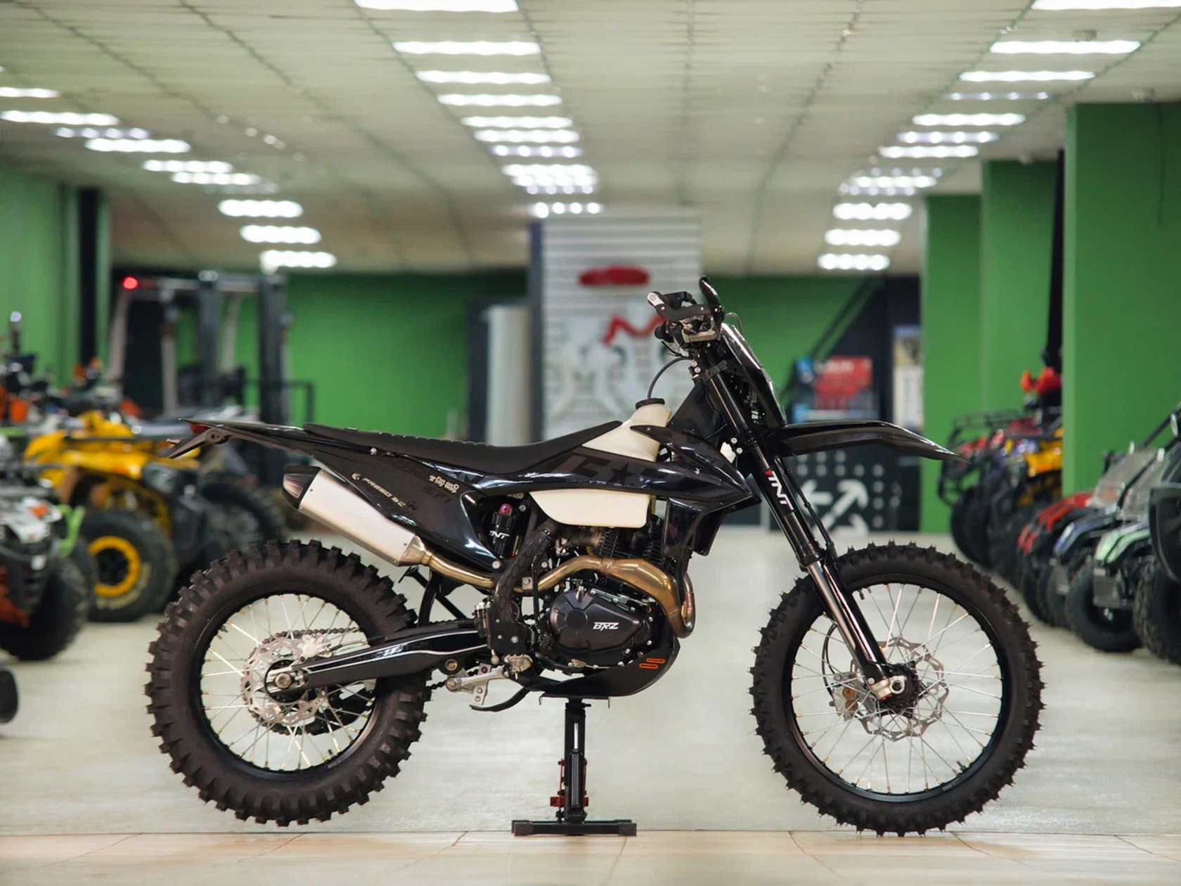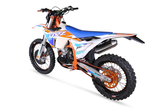 Комплектация Руль 28мм. Короткоходная ручка газа. Цепь 520. Алюминиевая литая лапка КПП, боковые накладки на рамы. Счетчик моточасов, приборная панель. Стоп сигнал, Грипсы Lock on, Защита рук Алюминиевая с пластиковыми щитками, Пластиковая защита радиатора.