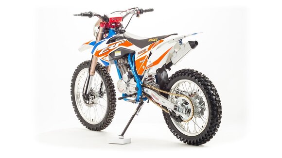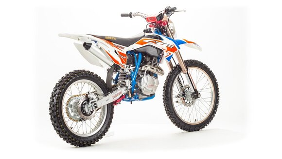 Подходит для новичков и любителей мотокросса. Идеален для бездорожья, его кроссовые шины (110-90) и (80-100) просто созданы для езды по мягкому и среднему грунту. Телескопическая вилка перевернутого типа позволяет легко преодолевать ямы, ухабы и другие неровности. Задняя подвеска маятниковая, с моноамортизатором.