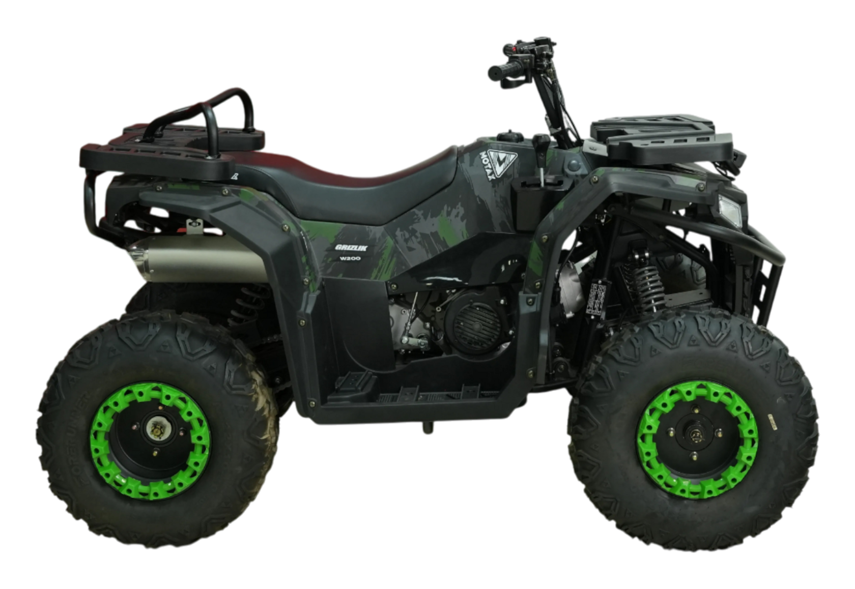 У квадроцикла MOTAX уверенный разгон и легкое управление, даже неопытный райдер с комфортом преодолеет неровные участки пути – всё благодаря независимому двойному амортизатору спереди и одиночному амортизатору удара сзади. Для удобного запуска в любых условиях в сборке у MOTAX GRIZLIK W200 электрический и ручной стартеры.