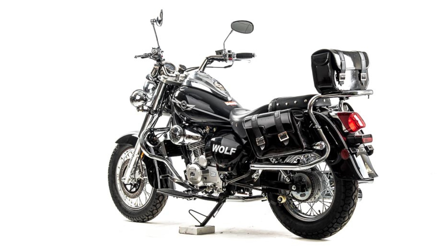 Комплектация Передний тормоз гидравлический дисковый с однопоршневым суппортом, прочно закреплён на 6 болтов. Тормозной шланг защищён специальным изолятором. Задний тормоз барабанный, легко регулируется даже в полевых условиях.Руль сечения 22 мм с высоким подъёмом удобен для мотоциклистов разного роста. Зеркала заднего вида большие, с хорошим обзором. На ручках расположены кнопки дальнего и ближнего света, сигнал аварийной остановки, кнопки включения и выключения двигателя, блинкер, поворотники, звуковой сигнал. Также на руль вынесен подсос, что удобно при холодном запуске.Мотоцепь 420 защищена специальным кожухом. На чоппер установлены 2 выхлопные трубы.