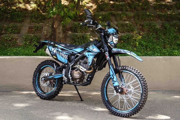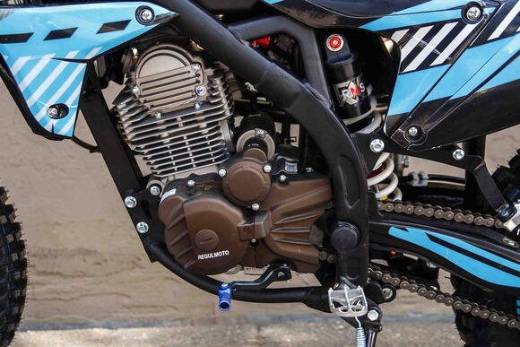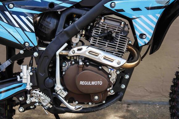 Regulmoto ZR 250 Enduro 2021г.«Regulmoto» представляет вниманию поклонников фри-райда мотоцикл Regulmoto ZR 250 Enduro. Стильный и доступный байк многоцелевого назначения найдет применение в качестве надежного аппарата для покорения бездорожья, а также может использоваться для решения широкого круга утилитарных задач и передвижения по дорогам общего пользования.В основе конструкции Regulmoto ZR 250 Enduro – мощная стальная рама, поставленная на колеса 21/18, которые наилучшим образом подготовлены к офф-роаду. Ободья и ступицы колес изготовлены из алюминия, также установлены усиленные спицы и буксаторы, надежно фиксирующие покрышки на ободе. Подвеску эндуро-байка представляют длинноходная телескопическая вилка-«перевертыш» спереди и стальной маятник с прогрессией и моноамортизатор с компенсационным резервуаром сзади. Работу амортизаторов при необходимости можно настроить при помощи регулировки сжатия/отбоя.Силовая установка мотоцикла представлена одноцилиндровым 4-тактным двигателем Zongshen SZ172FMM-3A с воздушным охлаждением рабочим объемом в 249,9 см3; за подготовку топливной смеси отвечает карбюратор Nibbi PE28. Технический потенциал надежного и производительного двигателя позволяет демонстрировать 21 лошадиную силу максимальной мощности и 18 Hm максимального крутящего момента.Regulmoto ZR 250 Enduro также привлекает внимание отличными внешними данными: мотоцикл комплектуется крепким и гибким пластиком с ярким дизайном, выполненным в узнаваемой стилистике популярной модели известного производителя. Подбор качественных компонентов также заслуживает внимания: