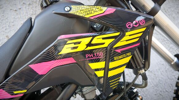 Питбайк BSE EX 125E MAX13 1.0 14/12 предназначен для активной и увлекательной езды на мотокроссах и отличается от аналогов в своем классе не только качеством, но и эксклюзивным дизайном от современного граффити-художника Max13 (Макс Торопов). Базой для этой модели стали шасси DX125, доказавшие надежность конструкции. На хроммолибденовой раме установлен 125-кубовый мотор Zonghshen, который производит максимально 10 л.с. Комбинируется он с простым в обслуживании и настройке карбюратором MIKUNI VM22, воздушным охлаждением и двумя типами запуска: кик- и электростартер.Мотоцикл получил также дисковые тормоза Mojo Racing с гидравлическим приводом и энергоемкую подвеску с вилкой-телескопом перевернутого типа. Дополненная усиленными колесными дисками и траверсами CNC комплектация наилучшим образом преодолевает неровности дороги. Для поездок в темное время суток востребованной станет мощная светодиодная фара.