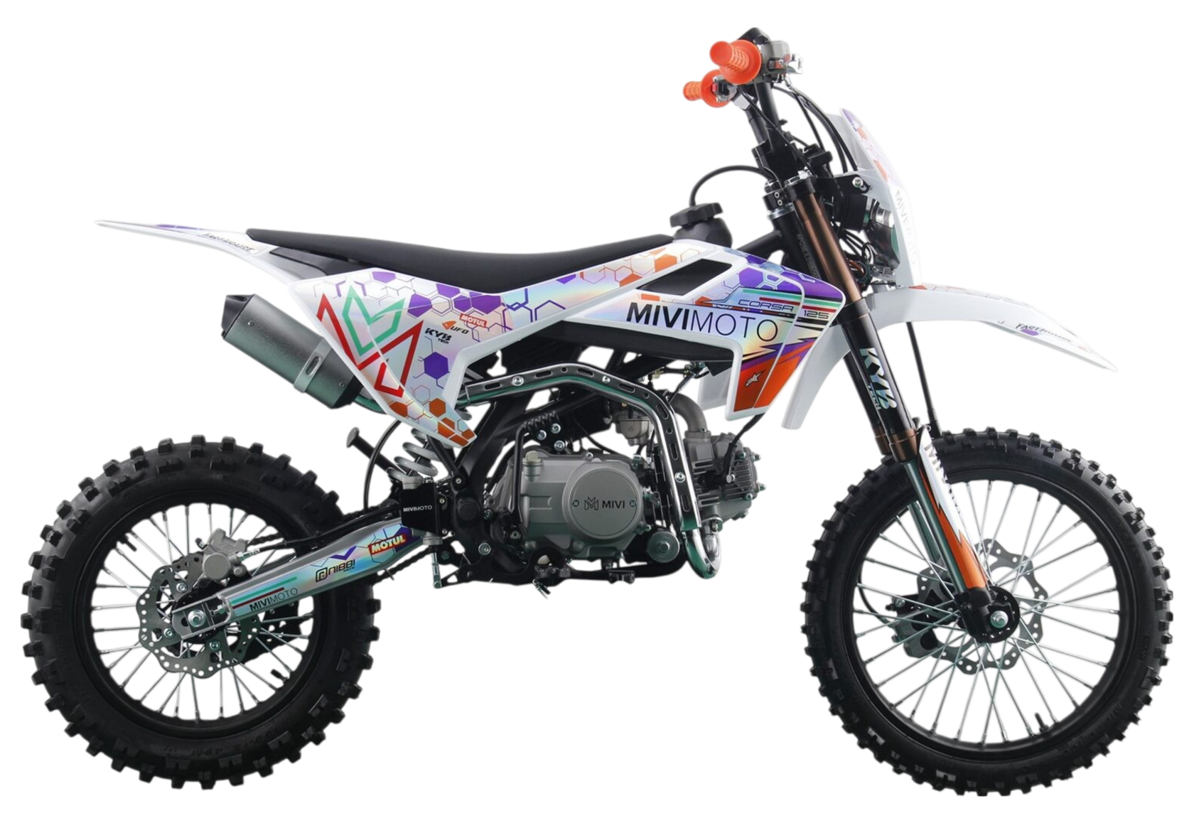 MIVIMOTO CORSA 125 — современный питбайк, созданный для тех, кто ценит динамику, точность управления и надежность в каждой поездке. Модель 2025 года идеально подходит как для активного отдыха, так и для освоения базовых навыков мотокросса.- Одноцилиндровый четырехтактный двигатель YX 125 см³ / 9 л. с. с воздушным охлаждением YX 125 см³ / 9 л. с. — проверенная платформа для стабильной работы в самых разных условиях. В сочетании с карбюратором Nibbi Racing PE19 он обеспечивает эффективную подачу топлива на всех оборотах.- Питбайк оснащен перевернутой телескопической вилкой KYB tech спереди и моноамортизатором с регулируемой жесткостью сзади. Конфигурация гарантирует комфортную амортизацию и устойчивость при езде по неровной местности.- Тормоза. Гидравлические дисковые тормоза HSK на обоих колесах обеспечивают точное и быстрое торможение в экстремальных условиях.- Питбайк оснащен светодиодной фарой для использования в ночное время и противоскользящим сиденьем.