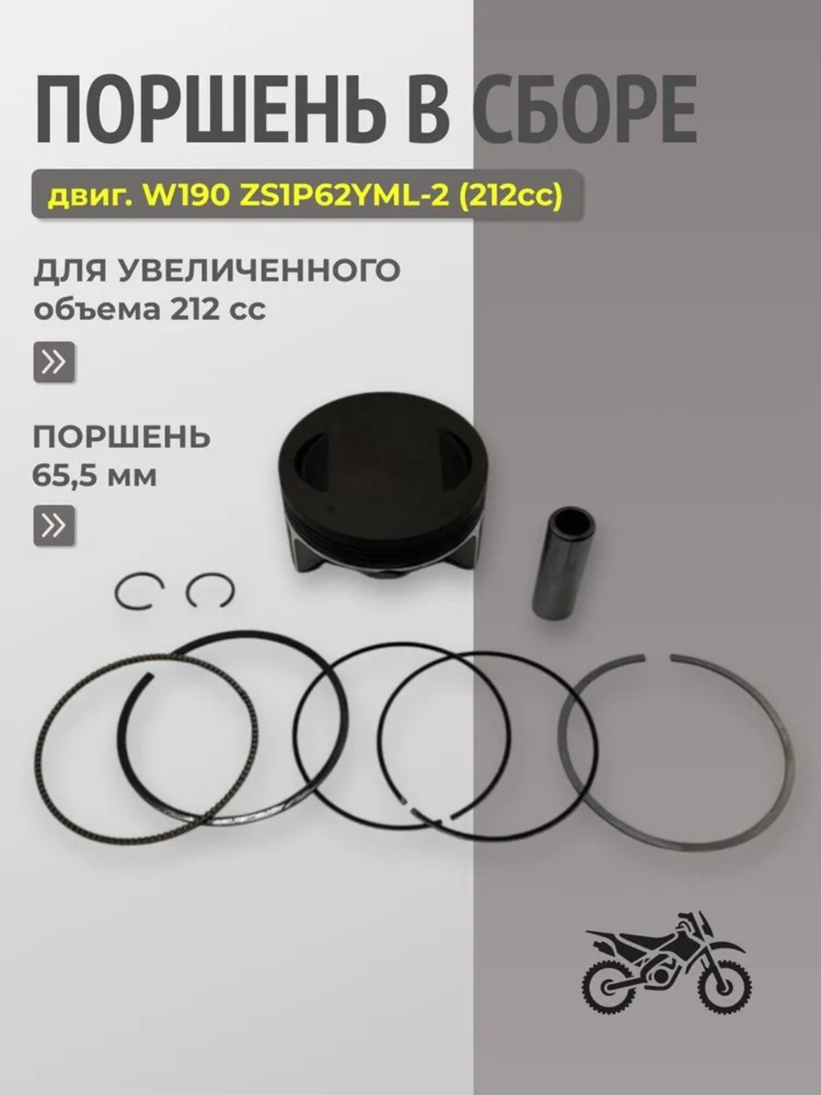 • Поршень диаметром 65мм для тюнинга двигателя ZS190. Предназначен для установки в комплекте с расточенным цилиндром или из "кита 212сс" для увеличения рабочего объема до 212cc. В комплекте: поршень, кольца, стопорные кольца, поршневой палец.